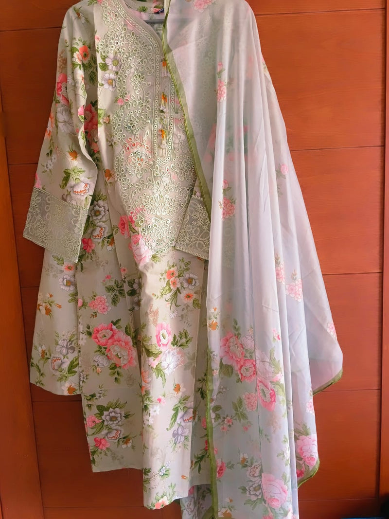 Stay elegant with this Beige Floral Printed 3 Piece Lawn Suit for women. Made from soft and breathable lawn fabric, this stylish outfit includes a printed kameez, matching shalwar, and a lightweight chiffon dupatta. Perfect for daily wear, office wear, and casual outings.